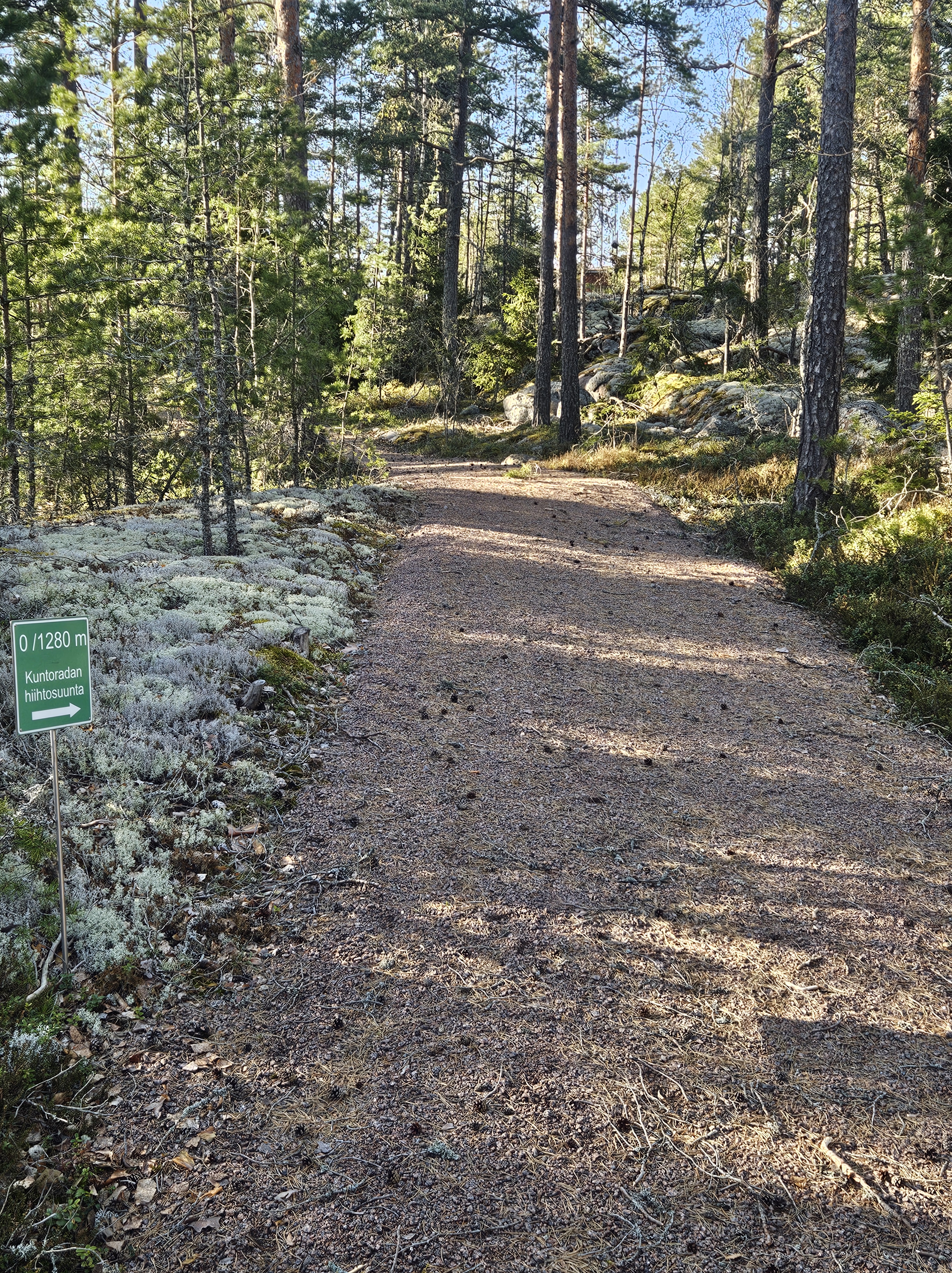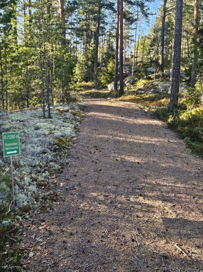 Uudenkaupungintieltä 3,1 km Helsinginrantaan150 m ylös mäkeen ja saavut parkkipaikalle.Kuntoradan alusta löydät opasteen jossa näytetään reitti ja korkeuserot.Ei muuta kun menoksi.